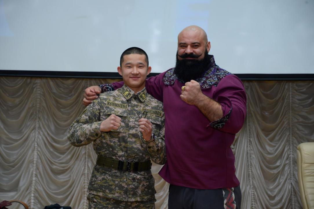 Показ силовых номеров произвел на воспитанников колледжа неизгладимое впечатление. Силач не просто разогнул калиброванную подкову, выдерживающую вес до 970 кг, но и свернул ее несколько раз. Таким образом он повторил номер великого казахского палуана Кажымукана Мунайтпасова. Поддался уверенным действиям спортсмена и эспандер, имеющий силу сопротивления до 300 кг. Затем он без особых усилий сделал сердечки из гвоздей, которые на память подарил уланам.