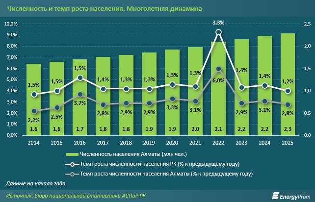 За последние 10 лет численность населения Алматы выросла на 42,8%. Если в 2014-м в мегаполисе жили 1,6 млн человек, то на начало 2025-го насчитывалось уже более 2,3 млн алматинцев. С учётом же того, что в Южную столицу приезжают на работу жители городов и сёл ближайшей Алматинской области, реальная численность населения мегаполиса в будние дни куда больше 3 млн человек. Общая численность населения в Алматинской агломерации уже превышает 3,8 млн человек.