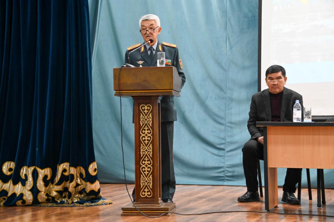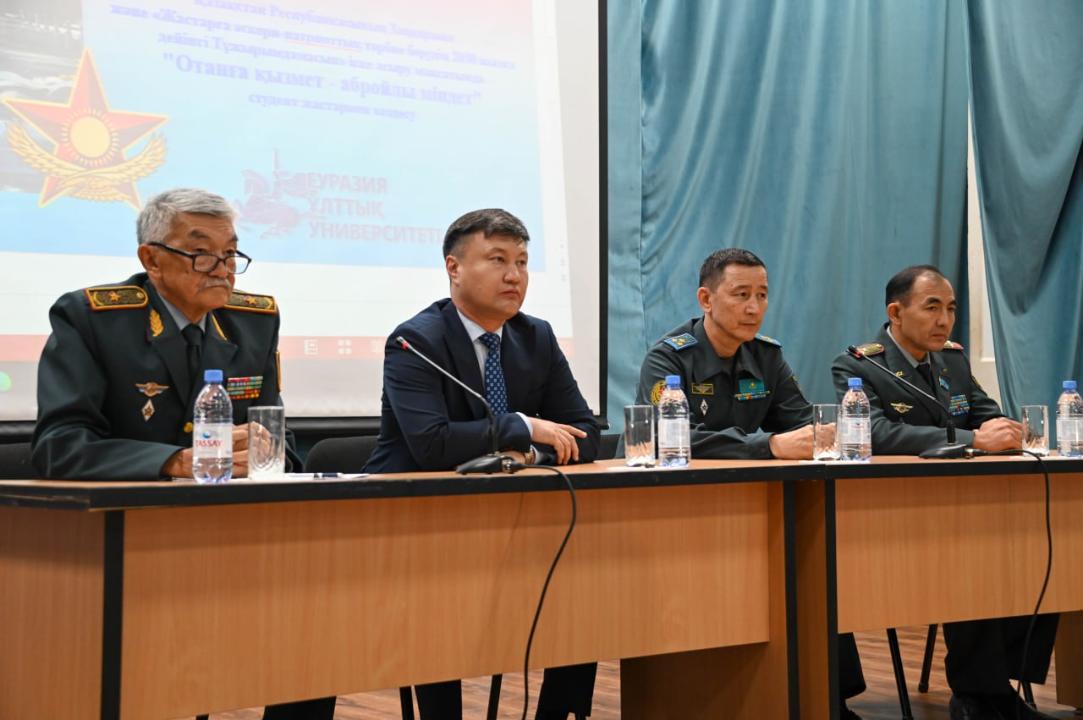 Проректор Ардак Бисембай, начальник военной кафедры генерал-майор Едил Оразов и полковник запаса Гани Артыков рассказали студентам о своем профессиональном пути, подчеркнув значение военной службы для воспитания лидерских качеств и гражданской ответственности.