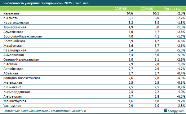 В региональном разрезе больше всего умерших в первом полугодии 2025-го пришлось на Алматы: 6,1 тыс. человек, против 6 тыс. человек годом ранее. Далее следуют Карагандинская (5,2 тыс. человек), Туркестанская (4,9 тыс. человек), Алматинская (4,6 тыс. человек) и Восточно-Казахстанская (4 тыс. человек) области. Наименьшие показатели численности умерших были зарегистрированы в Улытауской (933 человека), Мангистауской (1,6 тыс. человек) и Атырауской (1,7 тыс. человек) областях.