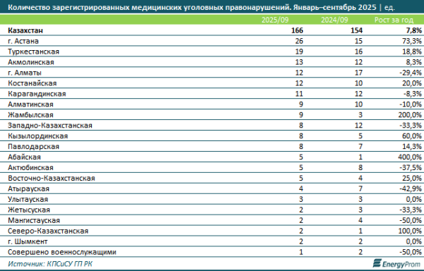 В региональном разрезе за январь–сентябрь 2025-го больше всего медицинских уголовных правонарушений было зарегистрировано в Астане: 26 случаев, против 15 случаев годом ранее. Второе и третье места антилидерства заняли Туркестанская (19 случаев) и Акмолинская (13 случаев) области. Меньше всего подобных правонарушений пришлось на Шымкент, а также на Северо-Казахстанскую, Мангистаускую и Жетысускую области: по 2 случая в каждом из регионов.