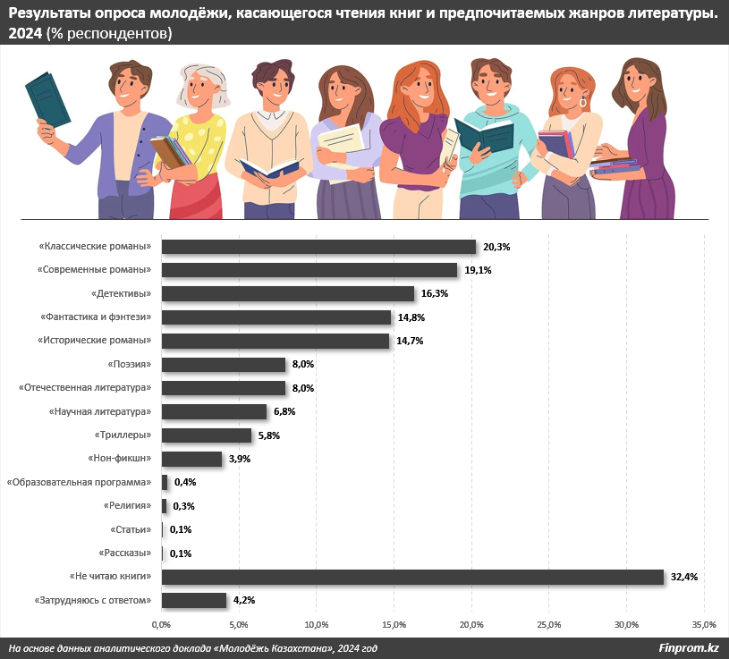 Согласно аналитическому докладу «Молодёжь Казахстана» за 2024 год, во время опроса, проведённого среди молодёжи страны, 32,4% респондентов отметили, что не читают книги. Среди мужчин такой ответ дали 36,8% опрошенных, среди женщин — 27,7%.