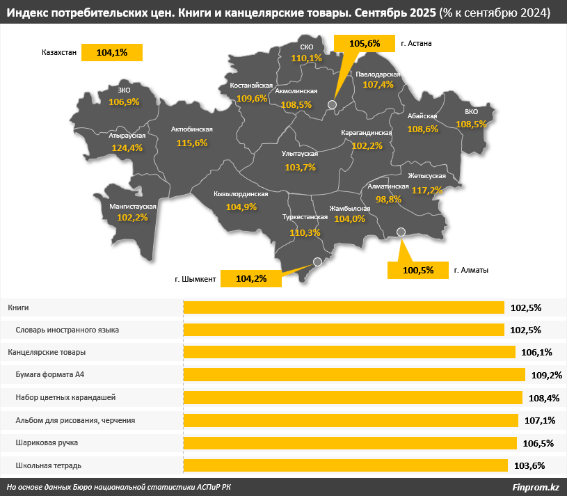 В региональном разрезе наибольший рост цен на книги и канцелярские товары был зафиксирован в Атырауской области: на 24,4% за год. Далее следуют Жетысуская (на 17,2%) и Актюбинская (на 15,6%) области. Наименьшее удорожание было отмечено в Алматы (на 0,5%), а также в Мангистауской и Карагандинской областях (на 2,2% в каждом из регионов). Из всех 20 регионов РК только в Алматинской области цены в секторе снизились на 1,2%.
