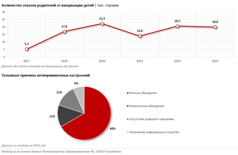 Судя по информации, которую Министерство здравоохранения РК ежегодно озвучивает в СМИ, ситуация пока складывается печально: в стране растёт количество отказов родителей от вакцинации детей. Так, если в 2017-м медики зафиксировали 5,3 тыс. отказов от прививок (не считая вакцинации против сезонного гриппа), то в прошлом году число отказов достигло 20,7 тыс. В 2025-м количество таких отказов уже составляет около 20 тыс.