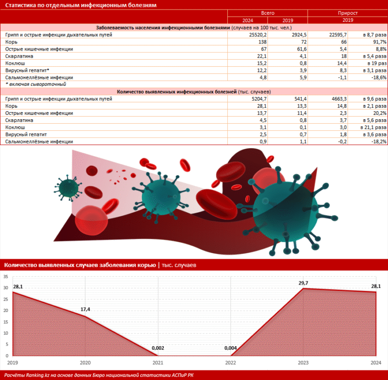 Большинство из них — вакциноуправляемые, и многие случаи заболевания можно было бы предотвратить. Сравним данные, публикуемые Бюро национальной статистики АСПиР РК, по заболеваемости на 100 тыс. населения за 2024 и 2019 годы. Так, в прошлом году заболеваемость коклюшем выросла по сравнению с 2019-м в 19 раз, скарлатиной — в 5,4 раза, вирусным гепатитом — в 3,1 раза, корью — почти в 2 раза. В абсолютных значениях количество случаев заболевания этими инфекциями также значительно увеличилось.
