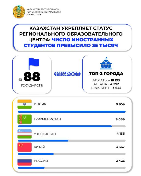 Казахстан стремительно усиливает свои позиции как один из ключевых образовательных центров Евразии. В 2025 учебном году в вузах страны обучаются 35 075 иностранных студентов из 88 государств, что демонстрирует устойчивый рост интернационализации и подтверждает конкурентоспособность отечественной системы высшего образования, передает DKNews.kz.
