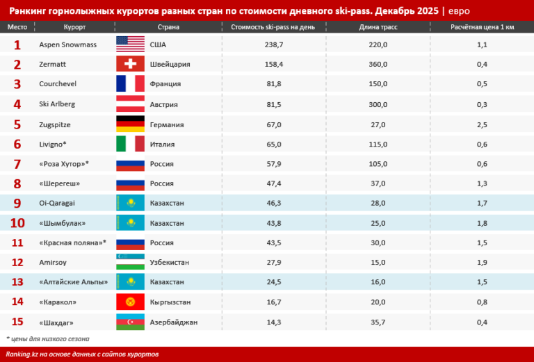 Казахстанские курорты в рейтинге оказались на 9-м, 10-м и 13-м местах: Oi Qaragai — 46,3 евро, «Шымбулак» — 43,8 евро, «Алтайские Альпы» — 24,5 евро. Более низкие цены наблюдаются на зимних базах отдыха в Кыргызстане и Азербайджане.