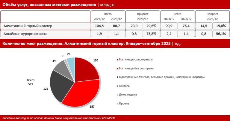 За январь–сентябрь 2025-го эти места размещения оказали услуг на 90,9 млрд тг — на 19% больше, чем за аналогичный период Прошлого года. В 2024-м услуги отелей, хостелов и других мест размещения Алматинского горного кластера составили 104,5 млрд тг (плюс 29,6% к предыдущему году).