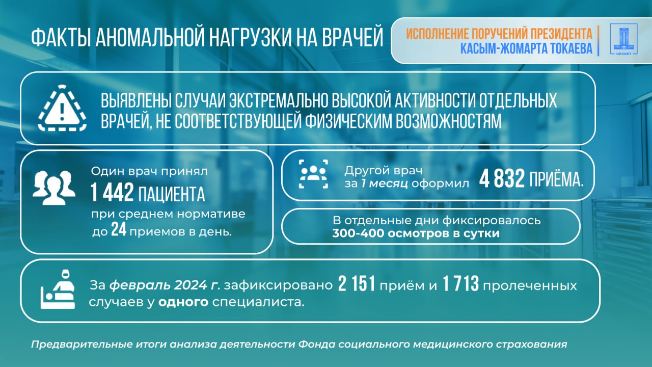 Так, в одной из частных клиник Астаны один врач за один день принял 1 442 пациента, при том что средняя норма - до 24 человек в день. В этой же клинике другой врач за месяц принял 4 832 пациента.