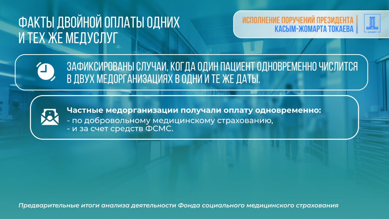- двойное финансирование одних и тех же услуг за счёт средств ОСМС и добровольного медицинского страхования работодателей;