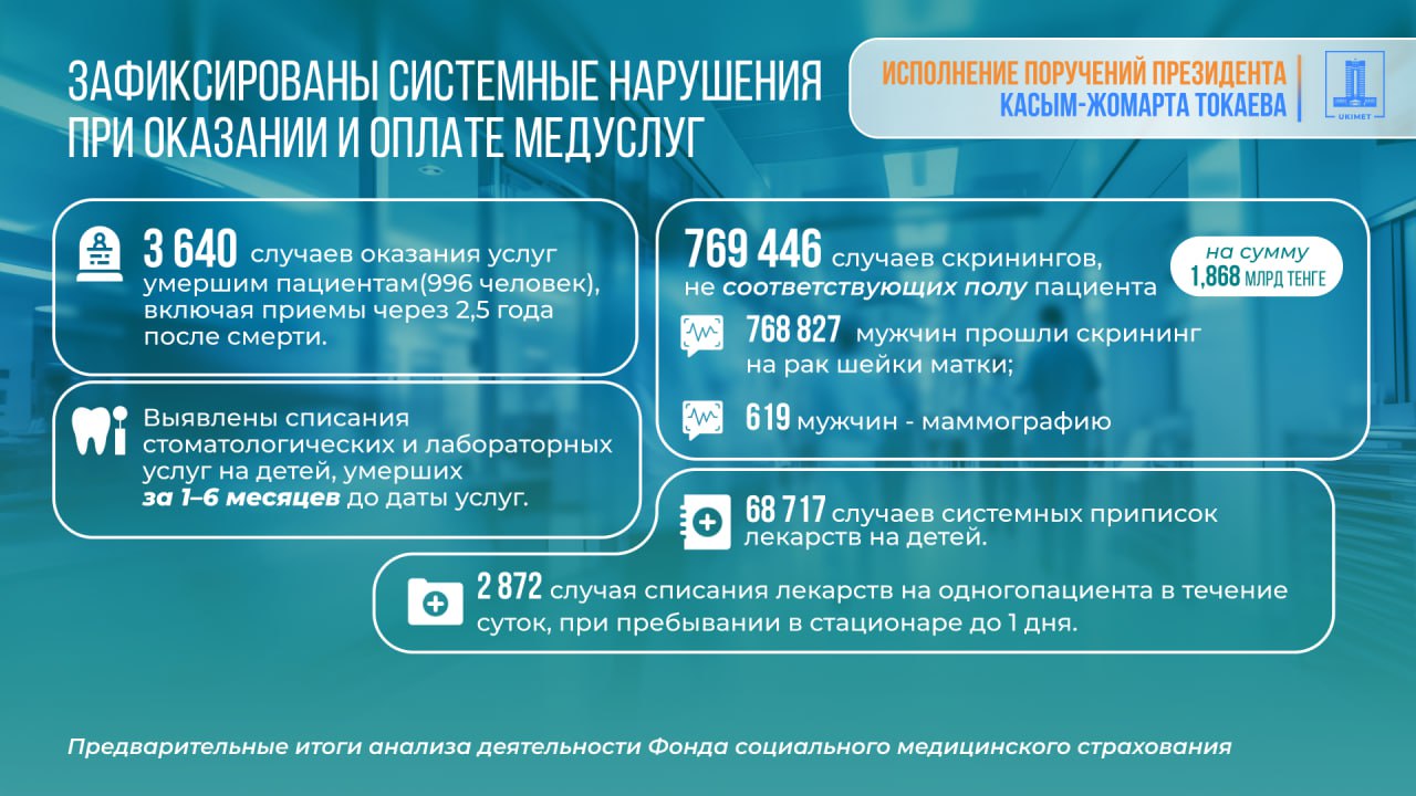 Не менее резонансные данные выявлены при анализе скрининговых программ. Зафиксировано 769 446 случаев скринингов, не соответствующих полу пациента, на сумму 1,8 млрд тенге.