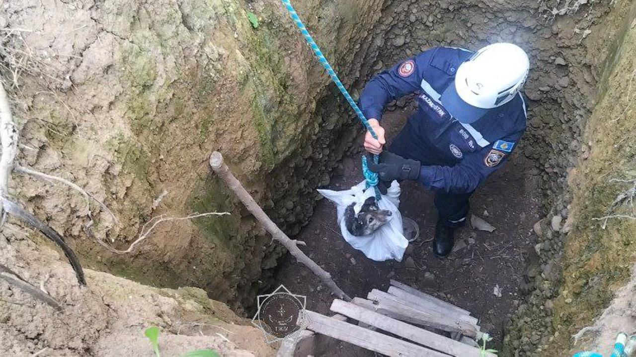 В Костанайской области ночью один из сотрудников с применением альпинистского снаряжения спустился на глубину около девяти метров, чтобы поднять щенка, упавшего в колодец.