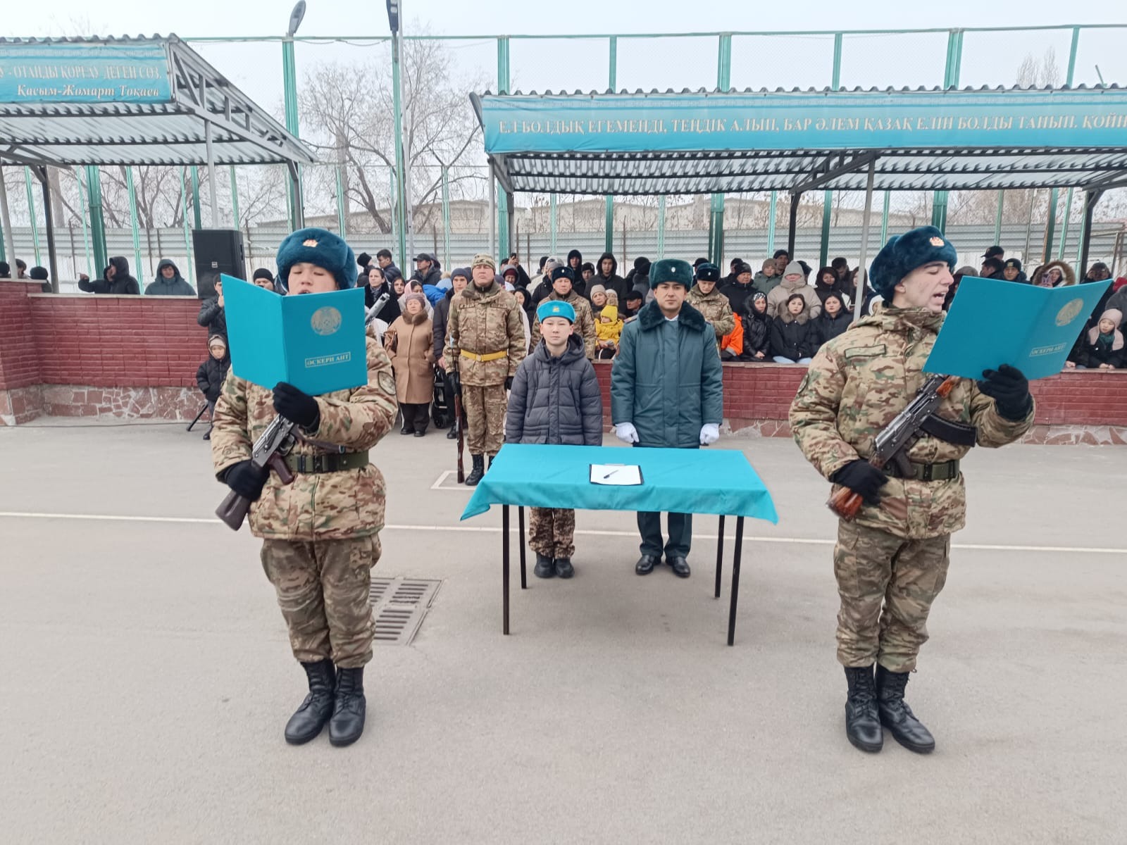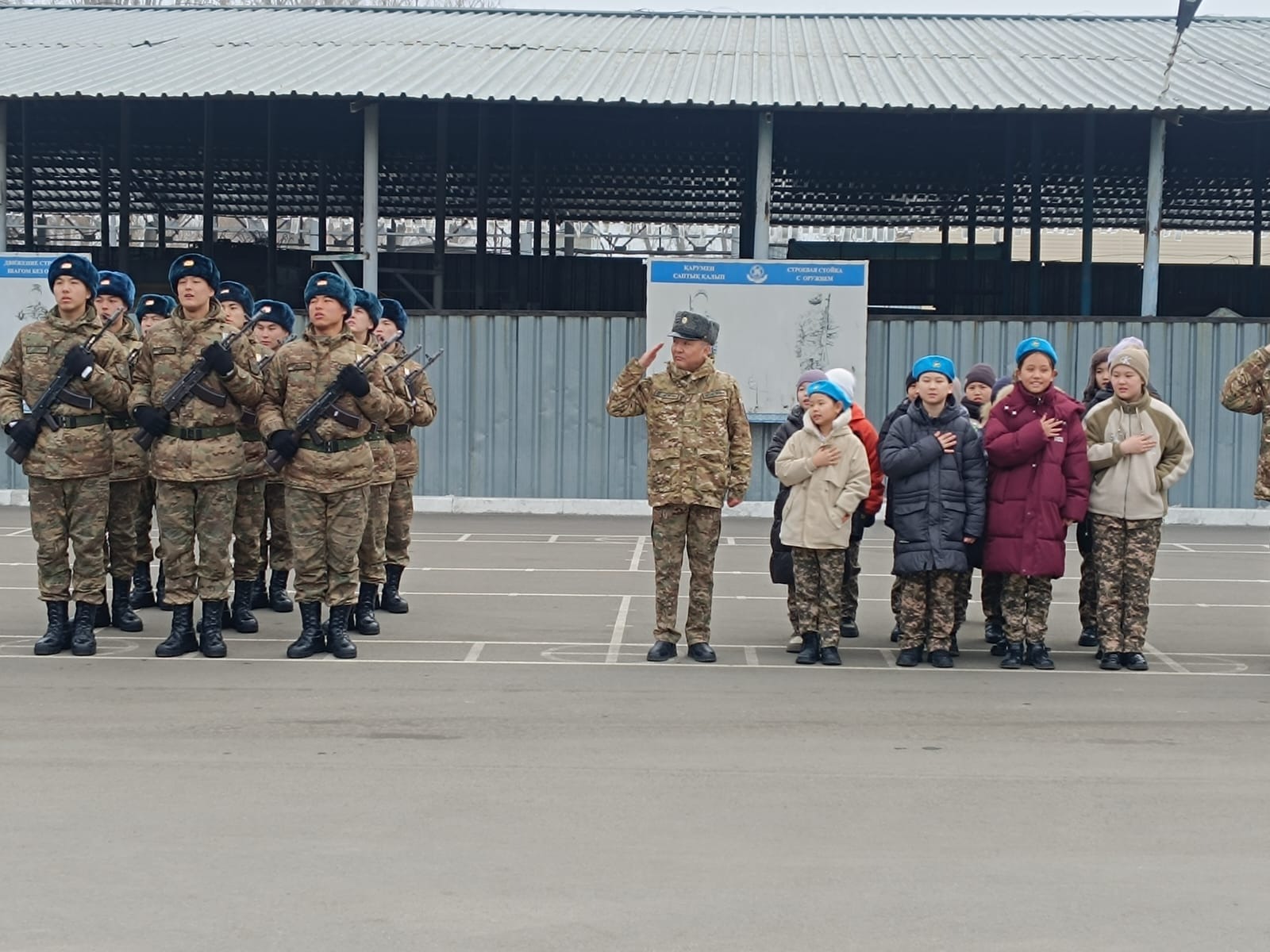 Перед началом церемонии учащиеся классов «Жас сарбаз» под руководством наставников — полковников запаса Ниязтая Алкешева и Елдоса Шалабаева — посетили территорию воинской части.