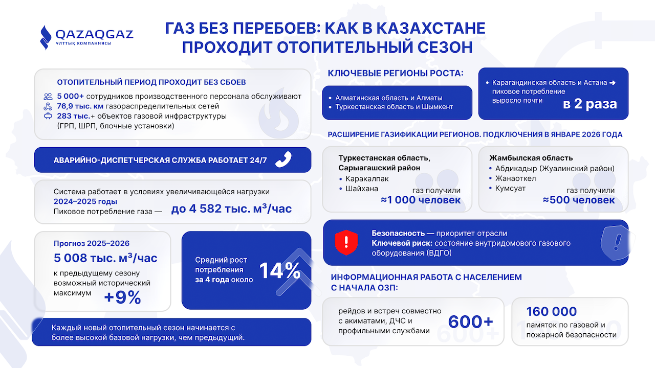 Казахстан входит в зиму с растущим спросом на газ, расширяющейся географией газификации и всё более сложной нагрузкой на систему. Пока газоснабжение остаётся стабильным, но тренды однозначны: впереди — ещё более напряжённые отопительные сезоны.