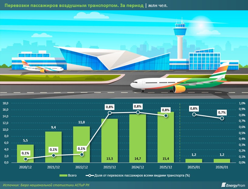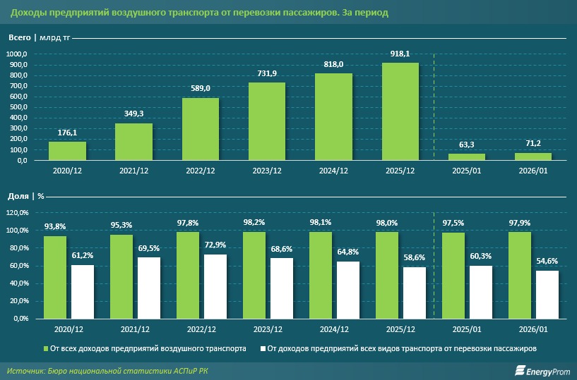 В январе текущего года доходы от авиаперевозок пассажиров составили 71,2 млрд тг (против 63,3 млрд тг в январе 2025-го), рост — на 12,5%. Доля доходов в секторе от всех доходов от перевозки пассажиров всеми видами транспорта при этом сократилась с 60,3% до 54,6%. Уменьшение этой доли не означает ослабления позиций авиации — скорее, другие виды транспорта наращивают доходы от пассажирских перевозок опережающими темпами.