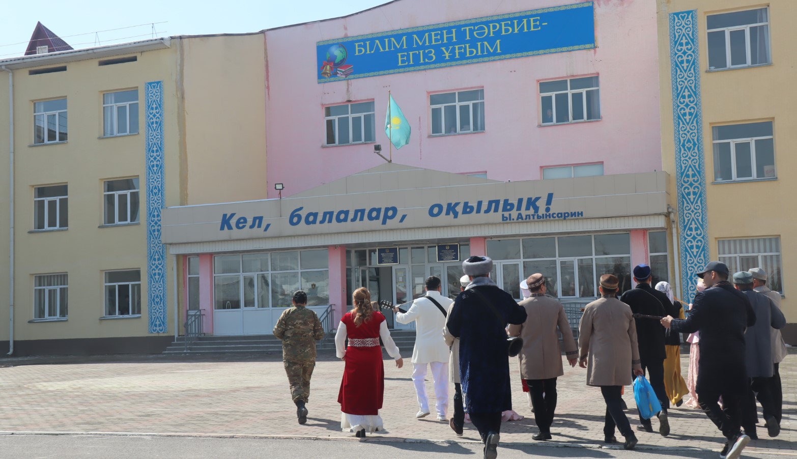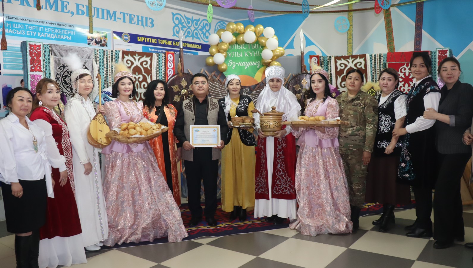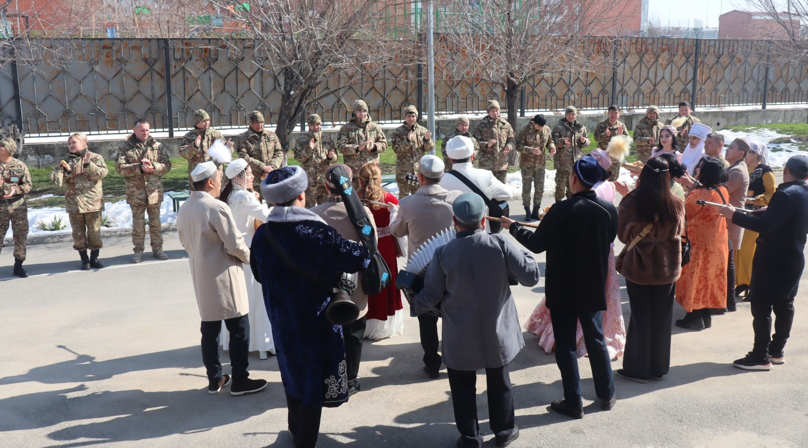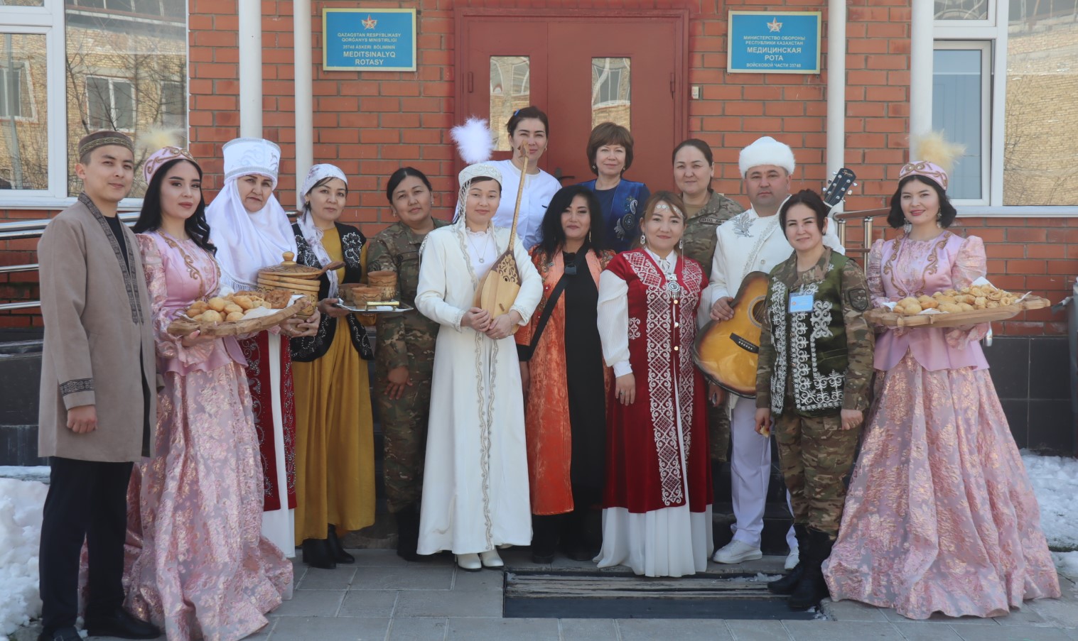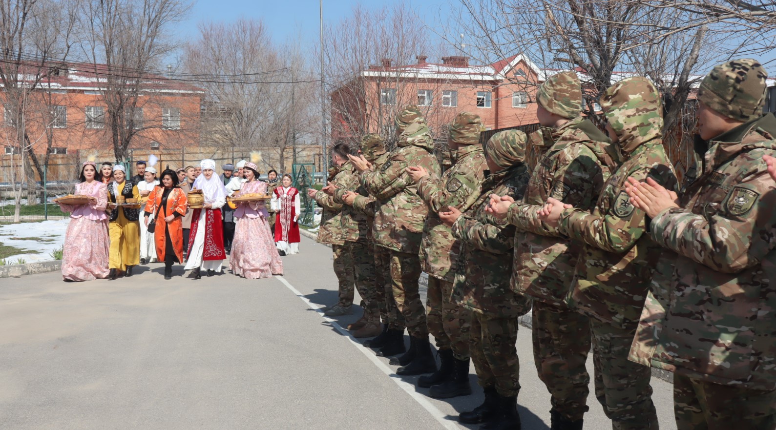 Под звуки военного оркестра, исполнявшего национальные мелодии, женщины-военнослужащие и гражданские сотрудницы части, одетые в яркие национальные костюмы, прошли по территории бригады — через штаб, учебные классы, казармы и медицинскую роту. В руках у них были традиционные угощения — баурсаки и кумыс.