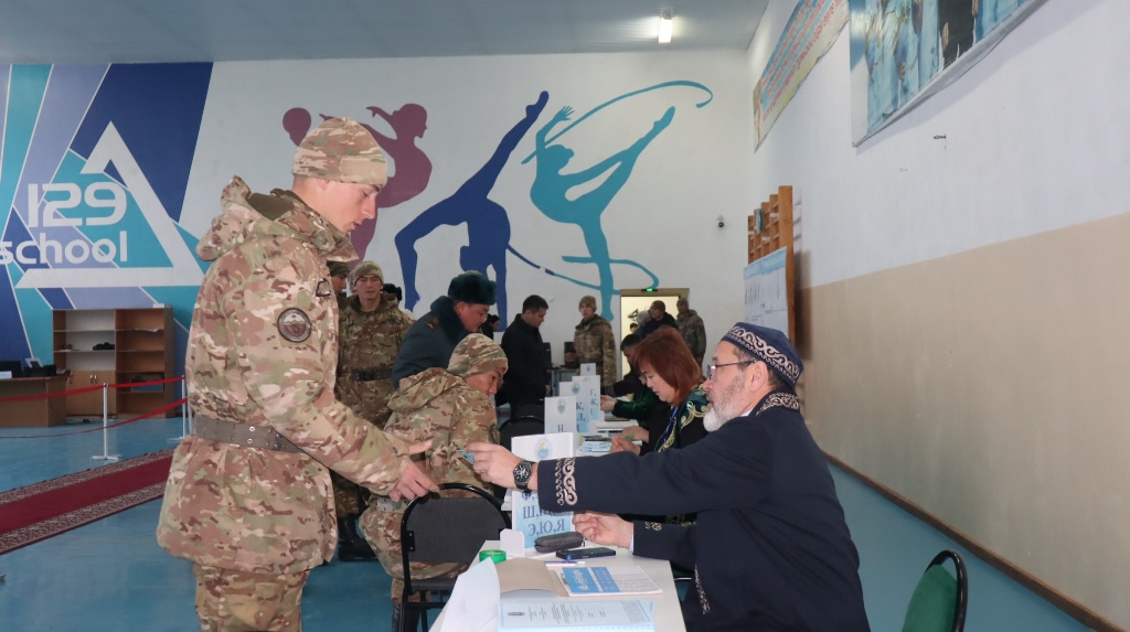 Официальное открытие избирательного участка прошло в торжественной атмосфере. По традиции прозвучал Государственный гимн Казахстана, который военнослужащие исполнили вместе.