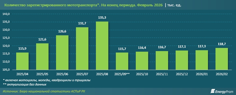 По итогам 2025 года казахстанский рынок мототранспорта продемонстрировал выраженную волатильность. В период с апреля, когда начали предоставлять данные о регистрации мототранспорта, по август количество зарегистрированной техники увеличилось со 115,9 тыс. до 135,3 тыс. ед., показав рост на 16,7% всего за четыре месяца. Уже в мае прирост составил 4,9% в месяц, затем темпы постепенно замедлялись до 2,7% в августе.