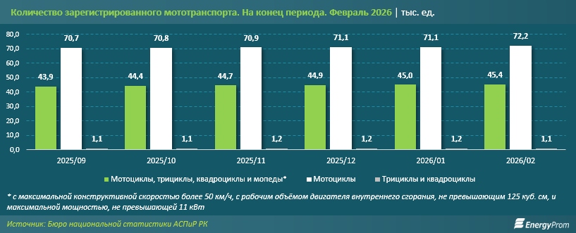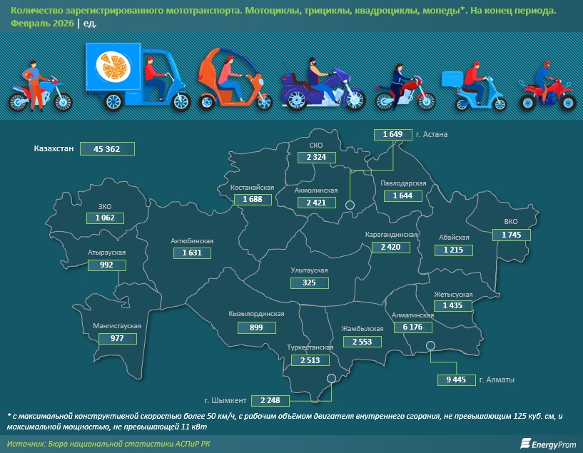 Региональное распределение зарегистрированного лёгкого мототранспорта отражает как плотность населения, так и специфику использования техники. Концентрация крайне неравномерна: на февраль текущего года на Алматы приходилось 9,4 тыс. ед., то есть каждый пятый мопед страны был зарегистрирован в Южной столице. Следом идут Алматинская (6,2 тыс. ед.), Жамбылская (2,6 тыс. ед.), Туркестанская (2,5 тыс. ед.), Акмолинская (2,4 тыс. ед.) и Карагандинская (2,4 тыс. ед.) области.