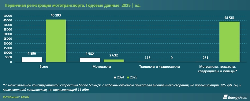 Параллельно наблюдался беспрецедентный всплеск первичной регистрации. Если в 2024-м за весь год было зарегистрировано 4,9 тыс. ед. мототранспорта, то в прошлом году показатель достиг 46,2 тыс. ед., увеличившись в 9,4 раза.
