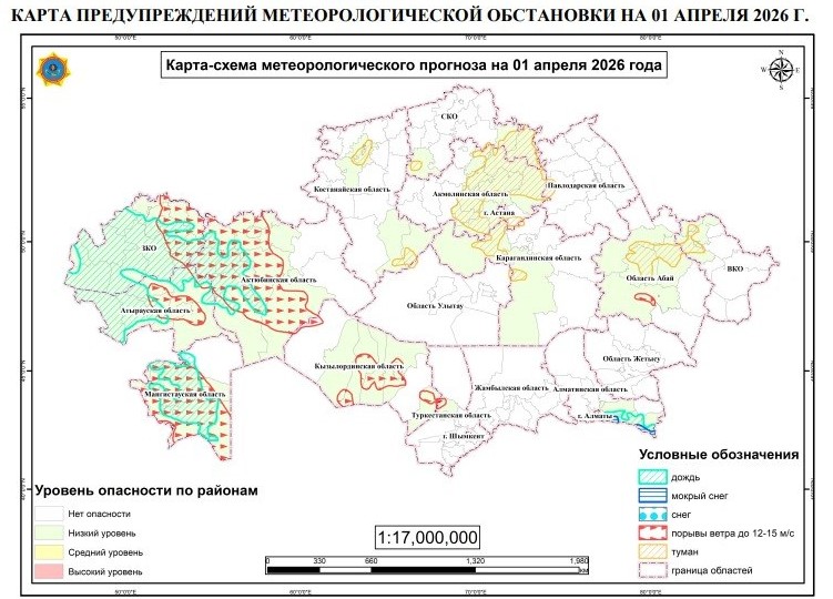 1 апреля не станет спокойным стартом весны: Казахстан ждёт целый набор погодных контрастов. Пока одни регионы будут наслаждаться сухой погодой, другие столкнутся с грозами, ветром и туманами. Весна в Казахстане — это всегда немного экстрима.