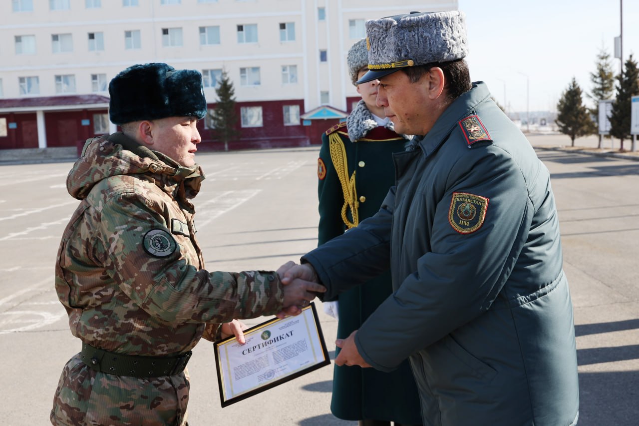 Сертификаты военнослужащим Астанинского гарнизона вручил заместитель министра внутренних дел — Главнокомандующий Национальной гвардией генерал-майор Ансаган Балтабеков.