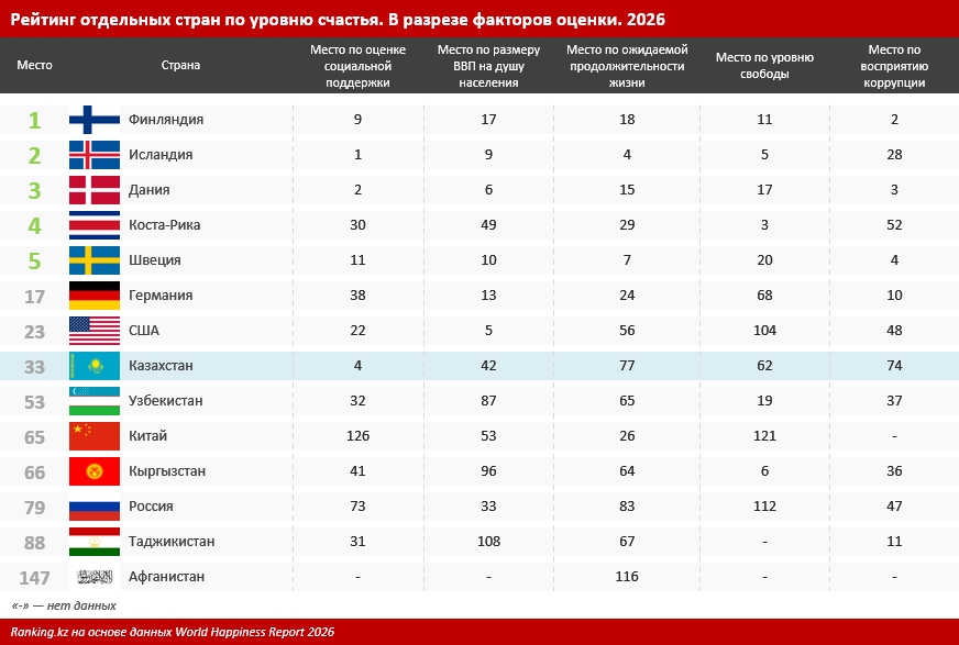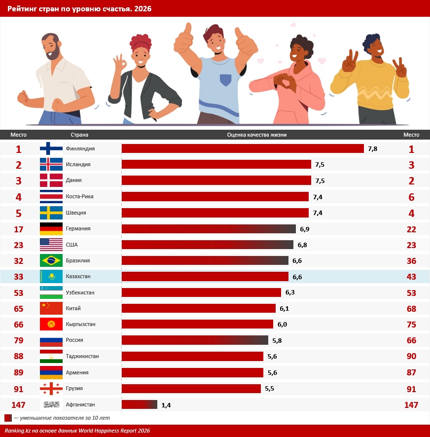 В сравнении со странами Центральной Азии и ближайшими соседями в Казахстане живут более счастливые люди. Наиболее близко к РК оказался Узбекистан, расположившийся на 53-й строчке мирового рейтинга с показателем в 6,3 балла. Кыргызстан попал на 66-е место с оценкой в 6 баллов. Россия за год потеряла 13 позиций и заняла срединное 79-е место в мире с более низким индикатором в 5,8 балла. На последнем месте рейтинга оказался Афганистан с оценкой в 1,4 балла.