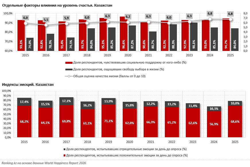 Общая оценка качества жизни рейтинга World Happiness Report в РК составила 6,6 балла из 10 максимально возможных. В отчёте за 2024 год показатель был меньше: 6,4 балла. Значение рассчитывается на основе нескольких индикаторов, среди которых ощущаемая социальная поддержка, благосостояние, свобода выбора, продолжительность жизни, благотворительность и восприятие коррупции. Данные собираются по итогам социологических опросов и статистических отчётов. Именно в Казахстане наибольший вклад в уровень счастья вносят первые три индикатора.