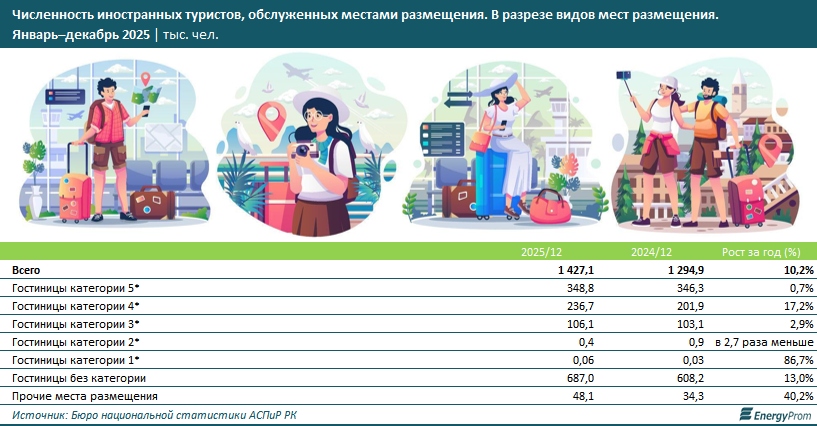 Ошибочно было бы думать, что иностранные туристы в основном останавливаются в дорогих пятизвёздочных гостиницах. На самом деле почти половина (48,1%) гостей из-за рубежа, обслуженных казахстанскими местами размещения, живут в простых гостиницах без категории. В 2025-м таковых было больше на 13%, чем годом ранее: 687 тыс. человек. Это указывает на востребованность бюджетного сегмента среди иностранных гостей. Значительный прирост показателя показали и прочие места размещения (хостелы, апартаменты, гостевые дома): численность останавливавшихся там въездных туристов выросла на 40,2%.