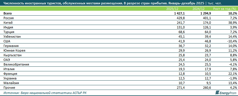 Среди стран, у граждан которых также наблюдался более заметный интерес к РК, стоит упомянуть Францию, рост численности посетителей из которой составил 22,1%. Туристов из Узбекистана стало больше на 14,4%, из Германии — на 14%. Сократился поток приезжающих в Казахстан из США (на 10,4%), Великобритании (на 4,1%) и Украины (на 1,9%). Таким образом, помимо роста общей численности иностранных туристов в 2025-м наблюдалась диверсификация этого «рынка»: наряду с традиционными источниками туристического потока (Россией и Китаем) увеличился интерес к РК со стороны граждан стран Европы и Южной Азии.