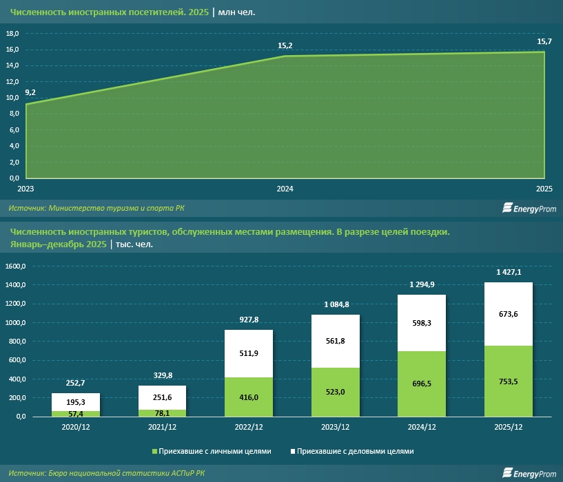Казахстан продолжает наращивать свой туристический потенциал в глазах жителей других стран. Численность приезжающих в РК иностранных туристов растёт уже несколько лет подряд. По предварительным данным Министерства туризма и спорта РК, в прошлом году страну посетили 15,7 млн гостей из-за рубежа — почти на 71% больше, чем по итогам 2023-го. Важное примечание: в эту категорию не входят люди, приехавшие в Казахстан на работу или на постоянное место жительства.