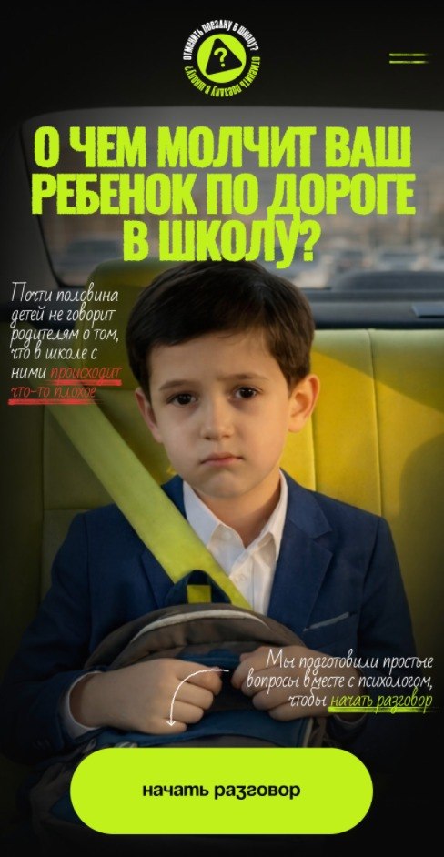 Инициатива получила название «Отменить поездку в школу?» и стартовала в Алматы в апреле 2024 года с участием одного из казахстанских райдхейлинговых сервисов. Основной идеей проекта является нестандартный подход к коммуникации с родителями: во время утренних поездок в школу на такси пользователи получают уведомление с предложением отменить поездку. Это неожиданное сообщение призвано вывести взрослых из повседневной спешки и обратить их внимание на эмоциональное состояние ребенка.