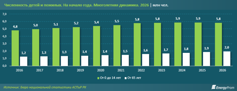 В то же время численность пожилых казахстанцев в возрасте от 65 лет непрерывно увеличивается: с 1,2 млн человек на начало 2016 года до 2 млн человек на начало 2026-го. За десятилетие численность пожилых людей в стране выросла сразу на 59,6% — гораздо заметнее, чем численность детей.