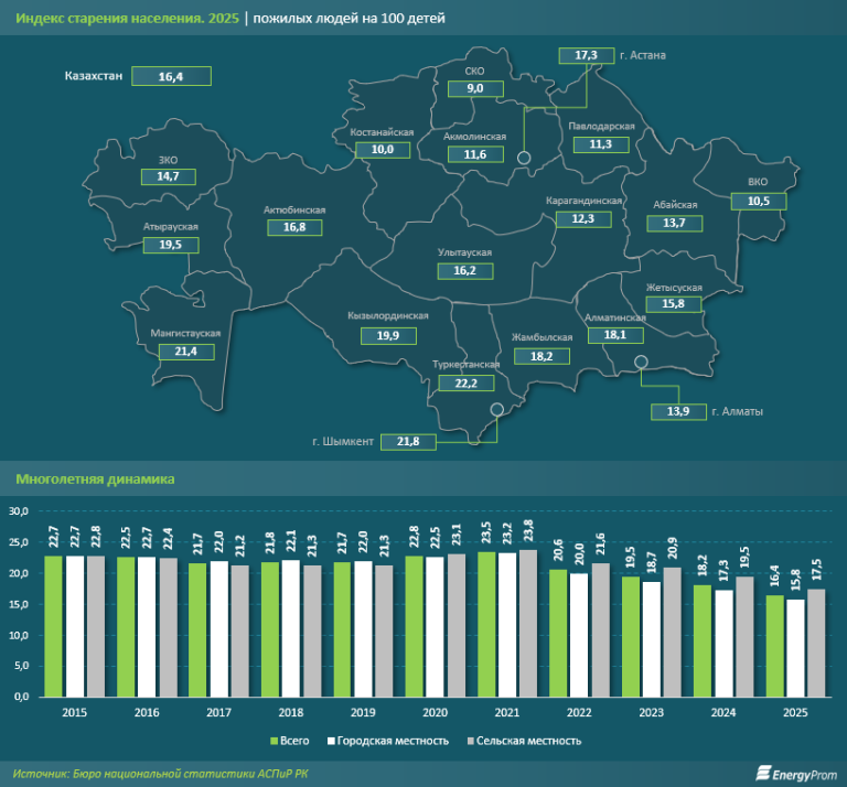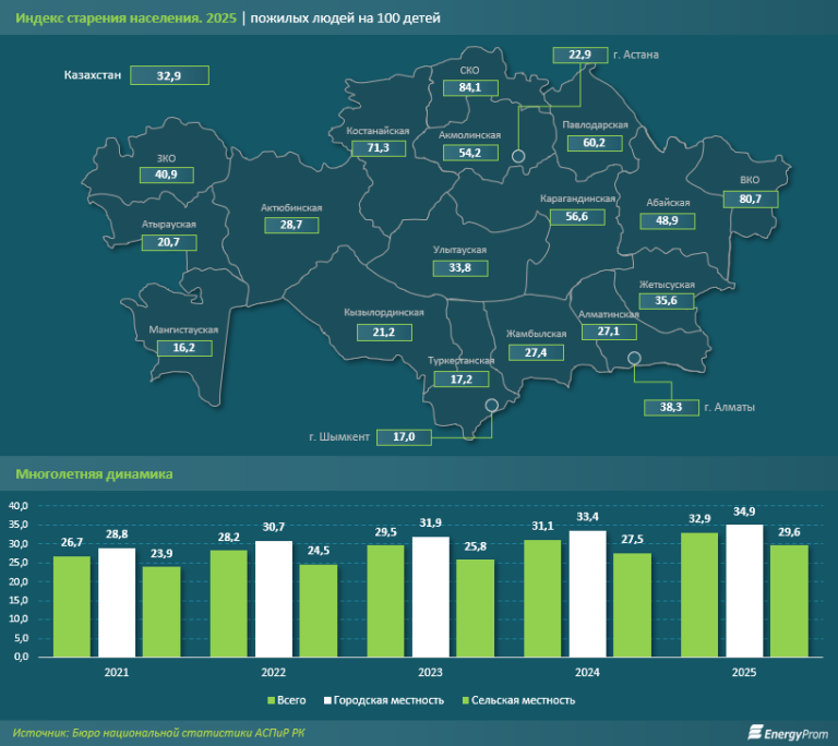 Региональная картина выглядела ещё более тревожно. В ряде областей страна уже фактически вошла в фазу выраженного старения. Самые высокие показатели были зафиксированы в Северо-Казахстанской (84,1), Восточно-Казахстанской (80,7) и Костанайской (71,3) областях. В этих регионах численность пожилых граждан в ближайшее время может сравняться с численностью детей. Карагандинская (56,6), Павлодарская (60,2) и Акмолинская (54,2) области также демонстрируют крайне неблагоприятную структуру населения.