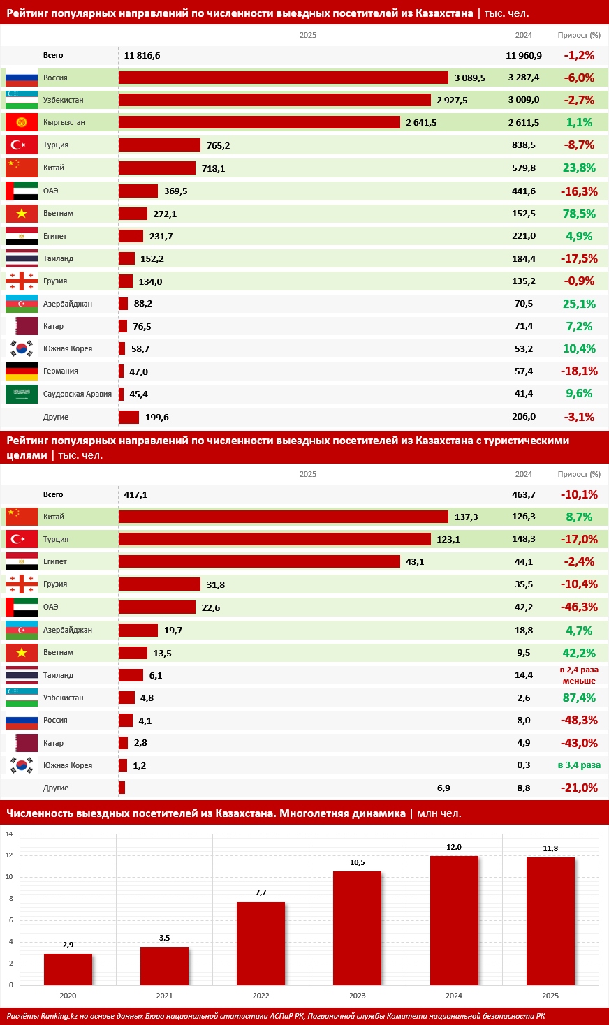 Для начала стоит определиться, что есть выезжающие за границу, а есть именно туристы — и это разные категории. Численность выездных посетителей в целом — то есть визитёров из РК в другие страны не для трудоустройства или ПМЖ — за 2025 год составила 11,8 млн человек — чуть меньше (на 1,2%), чем годом ранее.