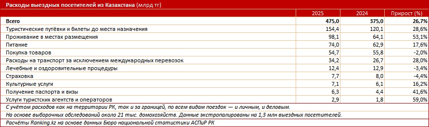 Ну и наконец поговорим о расходах на поездки и путешествия. Расходы выездных посетителей из Казахстана в 2025 году, согласно выборочному обследованию Бюро национальной статистики АСПиР РК, составили 475 млрд тг. Затраты ожидаемо выросли: на 26,7% за год.