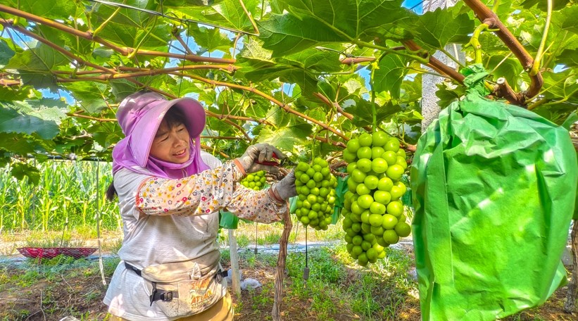 Когда лёгкий осенний ветерок проносится по полям, семейная ферма в посёлке района Сюэчэн города Цзаочжуан (Восточный Китай) переживает период сбора урожая. Гроздья винограда сорта «Шайн мускат», напоминающие полупрозрачные зелёные драгоценные камни, висят на ветвях, источая сладкий аромат ягод в тёплых солнечных лучах.