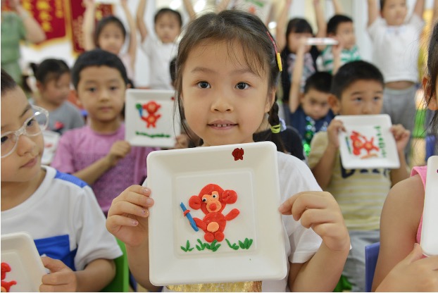 7月21日,江苏南京三之三幼儿园开展暑期夏令营,小朋友们学习制作非遗项目面塑。图为小朋友展示做好的面塑作品“孙悟空”。方东旭/人民图片