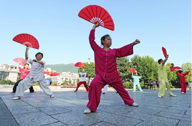 7月28日,贵州省铜仁市印江土家族苗族自治县的河边景观带上,市民健身队练习太极功夫扇。左禹华/人民图片