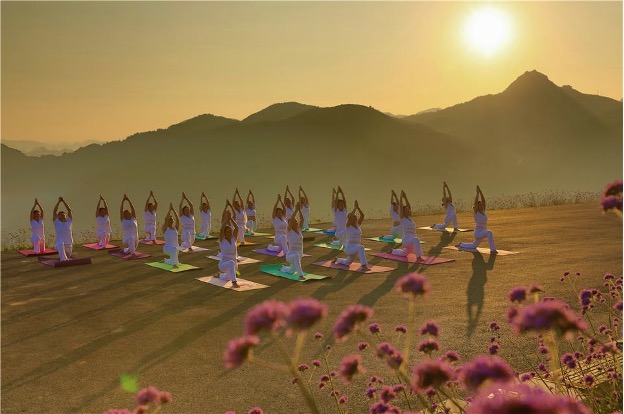 瑜伽爱好者在贵州省桐梓县娄山关街道杉坪村黔北花海中练习瑜伽。图:经济日报